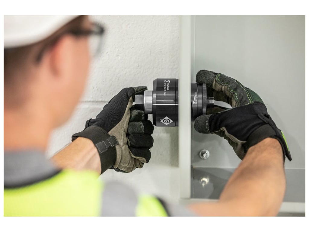 A New, improved high-leverage wrench with a five-degree ratcheting mechanism provides versatility and accessibility in tight spaces. The long, over-mold handle offers greater leverage, comfort and grip. Punch 1/2" to 2" conduit. 1 in hex ratchet wrench allows use with 3/8 in and 3/4 in draw studs. A unique punch profile also splits slugs for easier slug removal. Punches clean, uniform holes in 10-gauge mild steel, plastic, brass, copper & fiberglass.